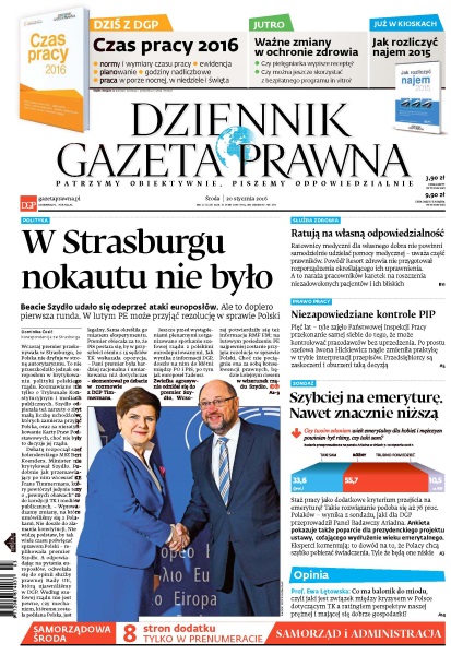 Beacie Szydło udało się odeprzeć ataki europosłów, ale to dopiero pierwsza runda - w lutym PE może przyjąć rezolucję w sprawie Polski; ratownicy medyczni dla własnego dobra nie powinni samodzielnie udzielać pomocy medycznej – uważa część prawników; pięć lat – tyle zajęło Państwowej Inspekcji Pracy przekonanie samej siebie do tego, że może kontrolować pracodawców bez uprzedzenia; staż pracy jako dodatkowe kryterium przejścia na emeryturę - takie rozwiązanie podoba się aż 76 proc. Polaków – wynika z sondażu, jaki dla DGP przeprowadził Panel Badawczy Ariadna; jaki jest związek między kryzysem w Polsce dotyczącym TK a ratingiem perspektyw naszej prężnej i mającej się dobrze gospodarki.