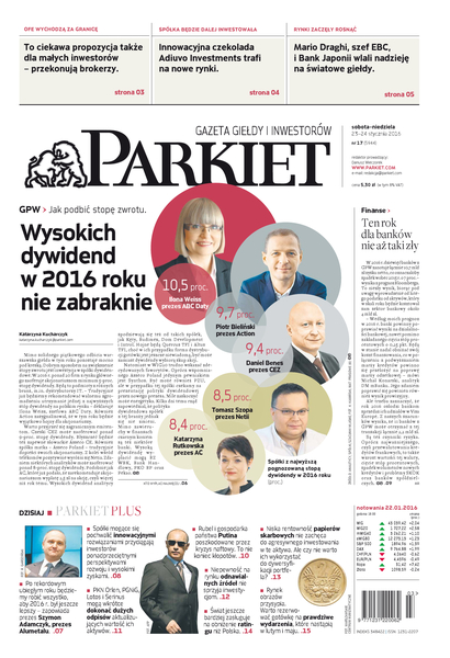 Największy w Polsce newsroom gospodarczy zbiera, analizuje i zgłębia dla Państwa najważniejsze informacje ze świata finansów. Codzienne wydanie „Parkietu”, sześć dni w tygodniu, to kilkadziesiąt artykułów o emitentach, instytucjach finansowych, gospodarce. To również opinie, felietony i wywiady z najważniejszymi ludźmi krajowej i globalnej finansjery.
