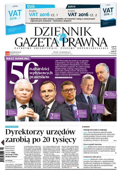 Lider PiS Jarosław Kaczyński po raz pierwszy w zestawieniu i od razu na czele, na drugim miejscu prezydent Andrzej Duda, a na trzecim sędzia Wojciech Łączewski - w 5. edycji naszego subiektywnego rankingu rządzą prawnicy spod znaku „dobrej zmiany”, ale są też inne; resort finansów ujawnił zasady obłożenia daniną handlowców - będą dwie stawki podatku i kwota wolna; Ministerstwo Zdrowia wskazało jasno - przedsiębiorcom mającym powyżej jednego procenta placówek w województwie należy odbierać zezwolenie; obniżenie wieku emerytalnego powinno być połączone z ograniczeniem możliwości dorabiania do świadczeń z ZUS - taki postulat zgłosił do prezydenckiego projektu Sąd Najwyższy; rząd doceni kierownicze stanowiska - pensje mogą wzrosnąć o kilka tysięcy złotych.