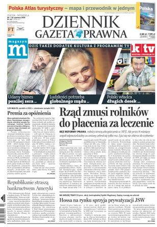 Bez reformy prawa rolnicy stracą ubezpieczenie w NFZ, ale przez osiem miesięcy zespół odpowiedzialny za zmiany zebrał się tylko raz i już się nie zbierze do wyborów; mimo opóźnień w budowie Stadionu Narodowego wynagrodzenie członków zarządu Narodowego Centrum Sportu wzrosło w trzy lata o 266 proc.;republikanie straszą bankructwem Ameryki; nawet 10 proc. będą mogli zarobić inwestorzy indywidualni podczas debiutu Jastrzębskiej Spółki Węglowej – uważają analitycy.