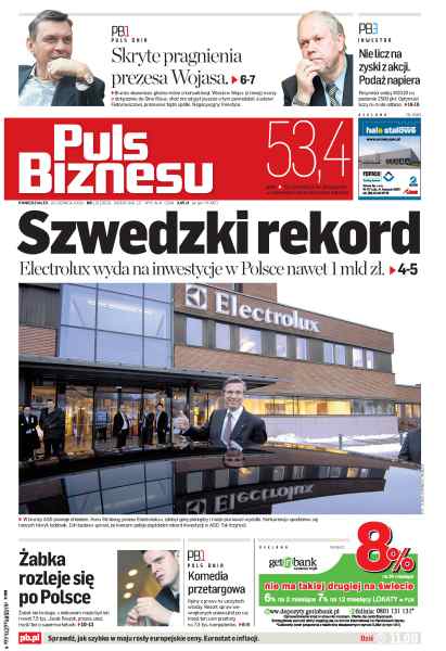 Electrolux przeznacza 1 mld zł na inwestycje w Polsce, konsolidacja firm obuwniczych - Wojas chce dołączyć do Gino Rossi, zmiany w prawie dotyczącym rynku usuwania azbestu, czeka nas gorący tydzień na GPW, papiery CEZ-u najlepszą lokatą dla inwestorów.