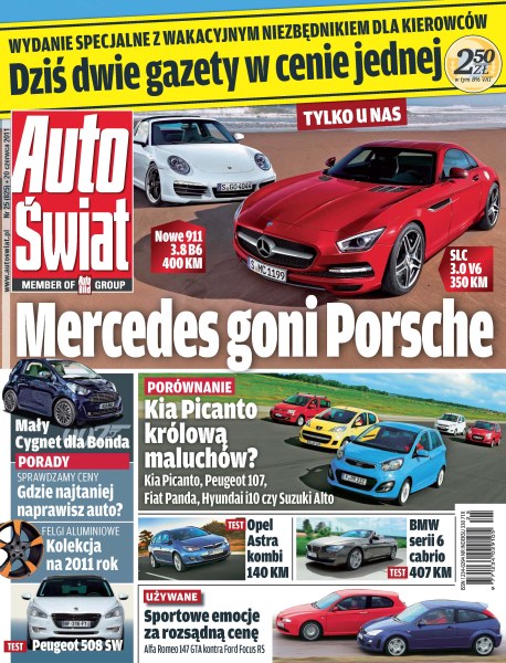 Nowy model Mercedesa atakuje niemiecką ikonę auta sportowego; kompaktowy SUV VW po face liftingu; Grand Prix Kanady dla Jensona Buttona; testy: Kia Picanto kontra Fiat Panda, Hyundai i10, Peugeot 107 i Suzuki Alto, Peugeot 508 SW, BMW 6 cabrio, Toyota Verso S, Opel Astra Sports Tourer; jak jeździć taniej – część VIII; alufelgi – przegląd nowości rynkowych; jakich środków nie wolno używać podczas mycia samochodu; używane: Alfa 147 GTA kontra Ford Focus RS I; gdzie najtaniej na przegląd; silnik 1.4 HDi, popularny diesel Citroëna i Peugeota montowany także w Fordach, Mazdach i Toyotach; Aston Martin Cygnet.