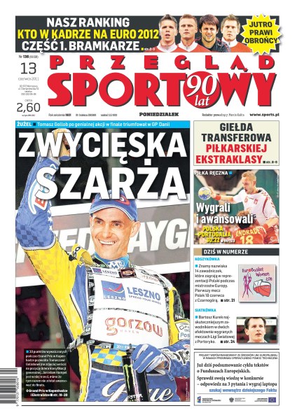 Tomasz Gollob wrócił na pozycję lidera klasyfikacji generalnej w żużlowym Grand Prix; znane są nazwiska 14 zawodniczek, które zagrają w reprezentacji Polski podczas mistrzostw Europy w koszykówce; Polska wygrała z Portugalią w eliminacjach do mistrzostw Europy w piłce ręcznej i zajęła pierwsze miejsce w grupie; Bartosz Kurek najskuteczniejszym zawodnikiem w dwóch wygranych meczach Ligi Światowej siatkówki z Portoryko.