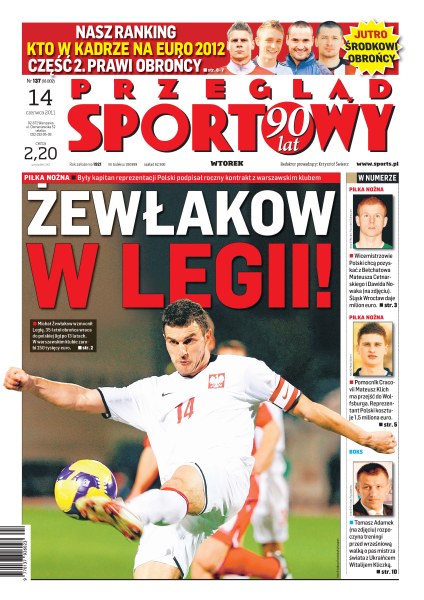 Michał Żewłakow, były kapitan reprezentacji Polski, podpisał roczny kontrakt z Legią Warszawa; szefowie Śląska Wrocław po raz kolejny składają transferową ofertę bełchatowianom; Wisła Kraków w nowym sezonie może mieć poważne problemy z linią obrony; polska reprezentacja piłkarska prezentuje coraz wyższy poziom; Tomasz Adamek rozpoczął przygotowania do wrześniowej walki z Witalijem Kliczką.