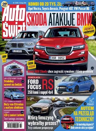 Skoda Kodiak i BMW X3 – nowe SUV-y już wkrótce; Hyundai Genesis G90 – luksusowa limuzyna z Korei; Volkswagen Tiguan – pierwsza jazda drugą generacją Tiguana; Ford Focus RS – tak jeździ najmocniejszy Focus; podatek od sprzedaży detalicznej – co się zmieni w zakupie i sprzedaży aut; Jaguar XF kontra Audi A6 i BMW 5 – porównanie limuzyn klasy wyższej z dieslami; Citroën Grand C4 Picasso – rodzinny van z 3-cylindrowym benzyniakiem 1.2.