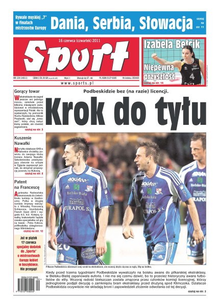 Pierwsze podejście spalone – klub Podbeskidzie Bielsko-Biała nie otrzymał wczoraj licencji na grę w ekstraklasie; poznaj najważniejsze wydarzenia letnich transferów; Arka Gdynia był w minionym sezonie jedynym zespołem, który nie wygrał meczu na wyjeździe; Dania, Serbia oraz Słowacja – takich rywali będzie miała polska reprezentacja piłkarzy ręcznych podczas pierwszej fazy mistrzostw Europy w 2012 roku.