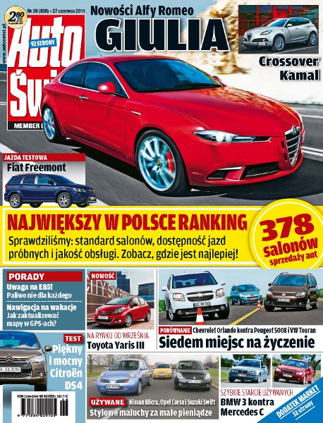 Nowości Alfy Romeo: Giulia, czyli następczyni 159, crossover Kamal i duży SUV z techniką Jeepa; Toyota Yaris, trzecia generacja małego „japończyka”; Fiat Freemont – van na bazie Dodge’a Journeya; porównanie 7-osobowych vanów: Chevrolet Orlando kontra Peugeot 5008 i VW Touran; Citroën DS4 – lifestylowy kompakt; Hyundai ix20 – początek testu długodystansowego; wielki test salonów cz. 2 – ranking 378 punktów i 18 marek; Starter – ubezpieczenie assistance dla klientów indywidualnych; paliwo E85 nie dla wszystkich; aktualizacja nawigacji; CB-Radio za granicą – gdzie wolno używać; używane: Nissan Micra, Opel Corsa i Suzuki Swift, Mercedes C 200 CDI kontra BMW 320d; turbodoładowany silnik benzynowy Volkswagena 1.4 TSI; auto-fascynacje: BMW Performance.