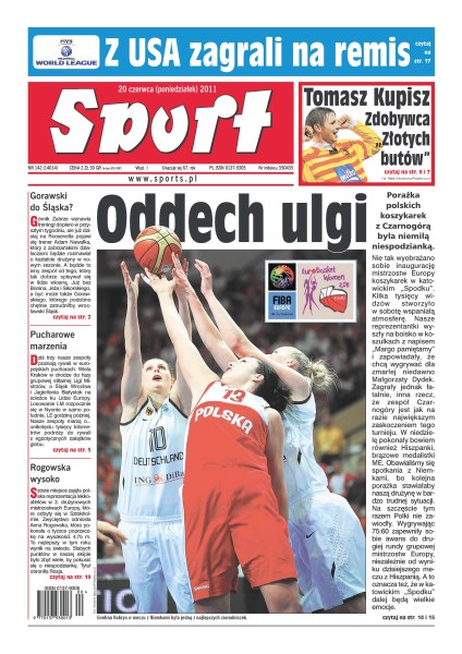 Wisła Kraków, Śląsk Wrocław i Jagiellonia Białystok poznają dziś rywali w europejskich pucharach; polska reprezentacja lekkoatletów zajęła szóste miejsce w trzecich drużynowych mistrzostwach Europy w Sztokholmie; Polska przegrała w sobotę z Czarnogórą i wygrała w niedzielę z Niemcami w meczach żeńskiej koszykówki Mistrzostw Europy; w Londynie rozpoczyna się 125. edycja Wimbledonu, Polskę reprezentować będzie m. in. Łukasz Kubot; rozmowa z Sylwią Jaśkowiec, dwukrotną młodzieżową mistrzynią świata w biegach narciarskich.