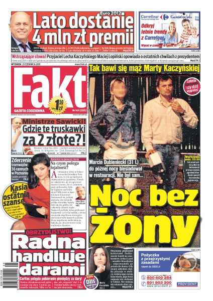 W Poznaniu zderzyły się tramwaje, 36 osób zostało rannych; Marcin Dubieniecki bawi się bez żony; Grzegorz Lato dostanie 4 mln zł premii od UEFA; Maciej Łopiński wspomina ostatnie chwile z prezydentem Lechem Kaczyńskim; truskawki są droższe, niż zapowiadał to minister rolnictwa Marek Sawicki; radna w Gdańsku bierze pieniądze od ubogich za dary, które przekazuje im Caritas; Jan Kulczyk znowu na szczycie listy najbogatszych Polaków; Katarzyna Zielińska zatańczy ze Stefano Terrazzino w „Tańcu z Gwiazdami”.