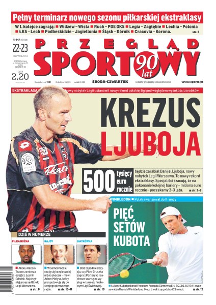 500 tysięcy euro rocznie będzie zarabiał Danijel Ljuboja, nowy piłkarz Legii Warszawa; pełny terminarz nowego sezonu piłkarskiej ekstraklasy; Łukasz Kubot awansował do II rundy Wimbledonu; Abdou Razack Traore zamierza odejść z Lechii Gdańsk; Adam Małysz przygotowuje się do swojego pierwszego rajdu samochodowego; dziś zapadnie decyzja czy Piotr Gruszka zagra w meczu z Portoryko i zachowa szansę na występ w turnieju finałowym Ligi Światowej.
