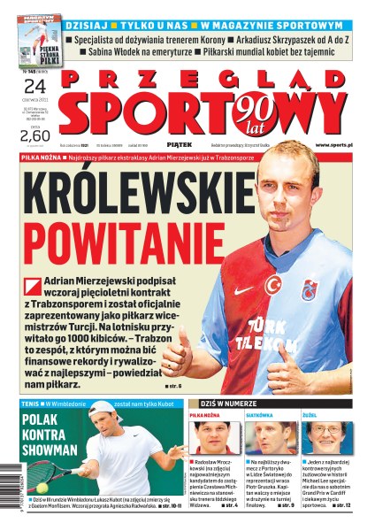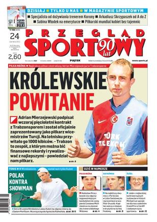 Adrian Mierzejewski podpisał wczoraj pięcioletni kontrakt z Trabzonem i został oficjalnie zaprezentowany jako piłkarz wicemistrzów Turcji; dziś w III rundzie Wimbledonu Łukasz Kubot zmierzy się z Gaelem Monfilsem; Radosław Mroczkowski najpoważniejszym kandydatem do zastąpienia Czesława Michniewicza na stanowisku trenera łódzkiego Widzewa; na najbliższy dwumecz z Portoryko w Lidze Światowej do reprezentacji wraca Piotr Gruszka.
