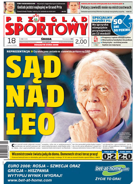 Sąd na Leo Beenhakkerem i występ Polaków w ocenie ekspertów; dwa ostatnie mecze fazy grupowej w „grupie śmierci”; wywiad z Arturem Borucem, Miroslavem Klose i Pawłem Janasem; 50 dni do olimpiady - przygotowania polskiej kadry; rozmowa z Tomaszem Kucharskim; Marcin Gortat analizuje grę Boston Celtics i LA Lakers.