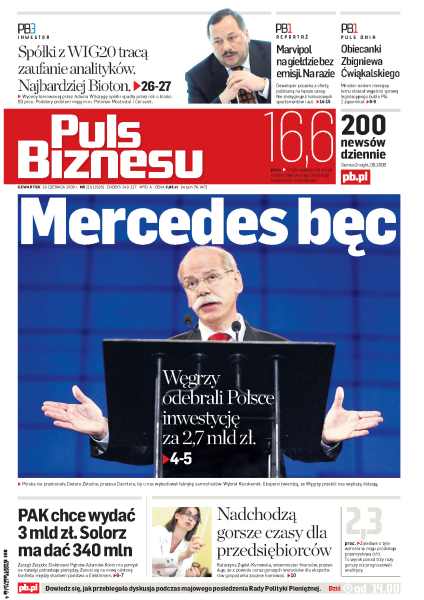 Węgry dostały fabrykę Mercedesa oraz EIT - może dla nas będzie PSA Peugeot-Citroen? Nowy prezes Dialogu chce, by spółka była warta 2,4 mld zł, 96,4% biur podróży łamie prawo, produkcja przemysłowa hamuje, logistyczna mapa Polski, analitycy zmniejszyli wyceny spółek z WIG20. Wydanie zawiera dodatek "Budownictwo".