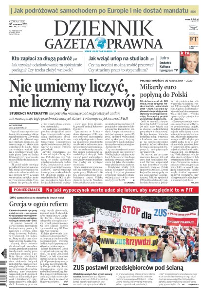 Studenci matematyki nie potrafią rozwiązywać najprostszych zadań, nie nauczą więc tego przedmiotu naszych dzieci; miliardy euro popłyną do Polski; Grecja w ogniu reform; ZUS postawił przedsiębiorców pod ścianą; jak wziąć urlop na studiach; kto zapłaci za długą podróż; jak podróżować samochodem po Europie i nie dostać mandatu.