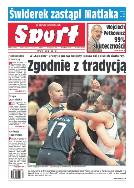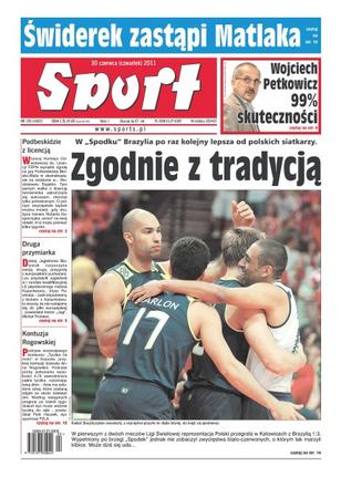 W „Spodku” Brazylia po raz kolejny lepsza od polskich siatkarzy; Podbeskidzie z licencją ekstraklasy; dzisiaj Jagiellonia Białystok rozpoczyna swoją drugą przygodę z europejskimi pucharami; podczas wczorajszego konkursu „Tyczka na molo” w Sopocie Anna Rogowska doznała kontuzji lewej dłoni; Świderek zastąpi Matlaka; Wojciech Petkowicz – 99% skuteczności.