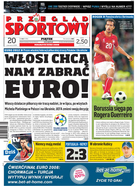 Włoscy działacze piłkarscy nie tracą nadziei, że w lipcu, po wizytach Michela Platiniego w Polsce i na Ukrainie, UEFA przyzna Włochom organizację Euro 2012; Borussia Dortmund poważnie zainteresowana Rogerem Guerreirą; pierwszy mecz ćwierćfinału - Portugalia pokonana 2:3; polska kadra od 22 lat ma kryzys formy - komentarze fizjologów i ocena Mike'a Lindemanna; Holandia górą - eksperci oceniają pierwszą część mistrzostw; żużel: obcokrajowcy wolą naszą Ekstraligę niż Elite League.