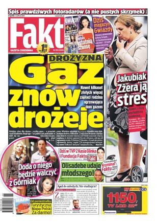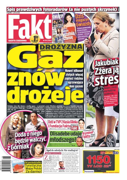 Gaz znów drożeje; Doda będzie walczyć o ukochanego z Edytą Górniak; Elżbieta Jakubiak nawet z mszy wychodzi na papierosa – zżera ją stres; Emmanuell Olisadebe udaje młodszego; spis prawdziwych fotoradarów, a nie pustych skrzynek.