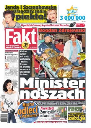 Minister kultury Bogdan Zdrojewski jest blady, wychudzony i zbolały – wczoraj na noszach wniesiono go do domu; czy Joanna Mucha odleci z Platformy; duch hrabiego zabija; kompromitacja warszawskich urzędników – zawiesili flagi odwrotnie; Grzegorz Lato ma limuzynę za 400 tys. zł; Janda i Szczepkowska urządziły sobie piekło.
