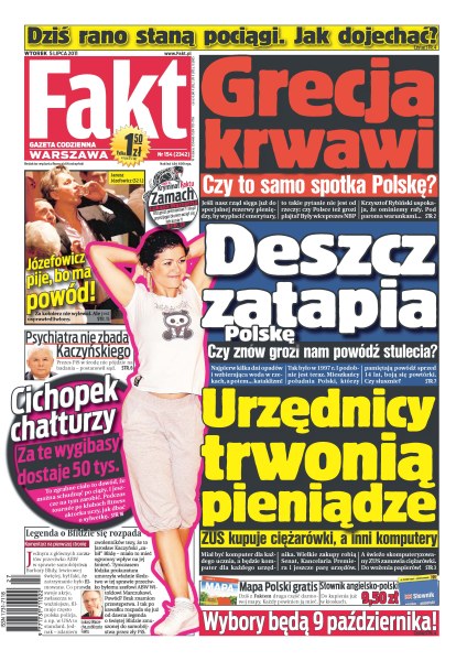 ZUS mimo komputeryzacji kupuje ponad 100 ciężarówek do przewożenia dokumentów; w ciągu trzech lat pensja mundurowych ma wzrosnąć o 450 zł; Ryszard Kalisz ma garderobę w swoim Jaguarze; gwałtowne burze i ulewy przetaczają się przez całą Polskę; dźwig budowlany zablokował lotnisko w Krakowie; Cichopek chałturzy w klubie fitness; Mateusz Damięcki chce rozwodu kościelnego; Dusan Kuciak robi wszystko, żeby porzucić rumuńskie Vaslui i przenieść się do Legii; Biała Gwiazda ma już praktycznie skompletowaną drużynę na zbliżający się sezon w ekstraklasie; sesja zdjęciowa pierwszej damy tenisa stołowego; Niemcy i Dania przywracają kontrole na granicach.
