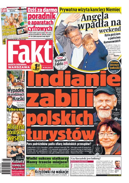 Indianie zabili polskich turystów w Peru; Angela Merkel z prywatną wizytą w Polsce; wypadek na urodzinach Piotra Kraśki; Alicja Bachleda-Curuś na góralskim weselu; kobiety szaleją za Kaczyńskim; wielki sukces siatkarzy: zajęli trzecie miejsce w Lidze Światowej.