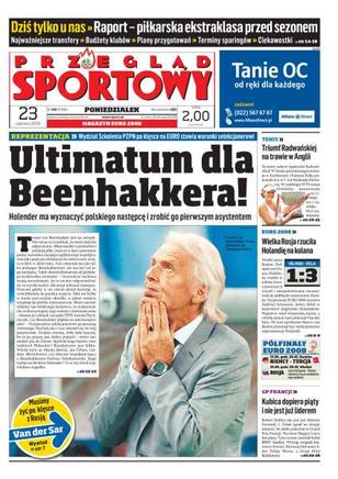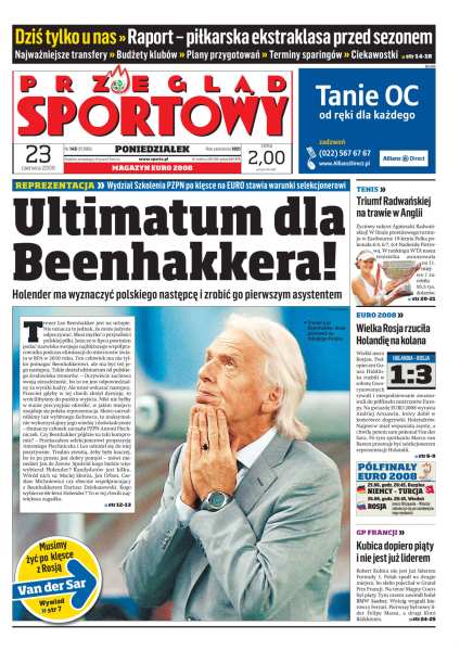Wydział Szkolenia PZPN stawia ultimatum Leo Beenhakkerowi, zaporowa cena może zatrzymać Artura Boruca w Celtiku, Rosjanie zagrali totalnie, Edwin van der Sar: trzeba będzie żyć z tą klęską, wywiad z Andriejem Arszawinem, raport: piłkarska ekstraklasa przez sezonem, morderczy finał Agnieszki Radwańskiej w Eastbourne, Robert Kubica piąty w Grand Prix Francji, dlaczego Nick Heidfeld ponownie zatrudnił swojego menedżera, drugie miejsce polskich lekkoatletów w zawodach o Puchar Europy i minimum olimpijskie Szymona Ziółkowskiego.