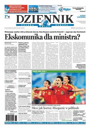 Śmierć polskiego żołnierza w Afganistanie, arcybiskup Tadeusz Gocłowski sugeruje, że minister Ewa Kopacz już jest pod ekskomuniką, 30 czerwca Lech Wałęsa wygłosi orędzie w TVP, połowa kadencji Lecha Kaczyńskiego, niezbędnik: jak zorganizować remont, firmy ubezpieczają się przed aktami terroru, nowy megatrend światowego biznesu, PZPN stawia ultimatum Leo Beenhakkerowi.