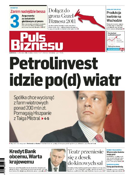 Petrolinvest idzie po wiatr: spółka chce wycisnąć z farm wiatrowych ponad 200 mln zł; zanim nadejdzie bessa: trzy argumenty za ostatnim giełdowym zrywem; dołącz do grona Gazel Biznesu 2011; koniunktura w UE: produkcja kwitnie na Wschodzie; Kredyt Bank obcemu, Warta krajowemu – bank jest zbyt drogi dla polskiego inwestora; od jesieni sztukę teatralną będzie można zobaczyć w kinie i to na żywo; właściciele klubów piłkarskich mają gest: na pensje wydają aż 75 proc. przychodów; ceny pod kontrolą: inflacja w czerwcu spadła bardziej niż przewidywali analitycy.