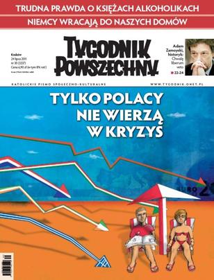 Temat „Tygodnika”: tylko Polacy nie wierzą w kryzys (ekonomia paniki; rozmowa z Jackiem Santorskim); trudna prawda o księżach alkoholikach; Niemcy wracają do naszych domów – Agnes Trawny i polskie lęki; Europa według PiS-u; czy światem rządzą agencje ratingowe; co to znaczy rozumieć swoją wiarę; rozmowa z ks. Bogdanem Giemzą o rachunku sumienia Kościoła w Polsce; 60. rocznica śmierci kardynała Sapiehy; rozmowa z Adamem Zamoyskim o historii bez dogmatów; rozmowa z Januszem Hołystem, badaczem cyberemocji; mord na Polakach w Peru – o Indianach opowiada ks. Roman Olesiński; Konstanty Gebert w debacie o Gazie, Izraelu i Flotylli Wolności; tragedia na Wołdze; sens życia według Harry`ego Pottera; rozpoczyna się 11. festiwal Nowe Horyzonty; perypetie Fundacji Czartoryskich; czy po sprawie „News of the World” polskie tabloidy się zradykalizują; o interesujących nowościach wśród gier planszowych.