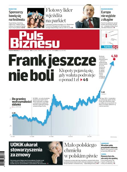 Grupa Żywiec, Carlsberg, mBank czy T-Mobile wydają miliony na muzyczne imprezy - czy im się to opłaca; powrót do zadłużenia sprzed kryzysu jest prawie niemożliwy — uważają analitycy Deutsche Bank Research; kredyty walutowe spłacają się znakomicie i trzymają się krzepko - starzeją się zupełnie inaczej niż na Zachodzie; producenci chmielu alarmują, że grożą im masowe bankructwa, ponieważ browarnicze koncerny wolą sprowadzać go z zagranicy; Wrocław chce oddać przystanki reklamie; unia zniosła bariery dla importu ze Wschodu, ale rolnicy nie odetchną.