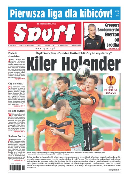 Śląsk Wrocław po 29 latach zdobył bramkę w europejskich pucharach; bramkarz Jagiellonii Białystok, Grzegorz Sandomierski, czeka na wynik negocjacji swoich pracodawców z przedstawicielami Evertonu w sprawie jego transferu na Wyspy Brytyjskie; w ćwierćfinale Copa America Brazylia po raz drugi w tym turnieju zmierzy się z Paragwajem; osiem dni, cztery konkursy i trzy skocznie - w sobotę po raz pierwszy rusza Lotos Poland Tour FIS Grand Prix; po latach Aleksandra Socha wróciła na podium mistrzostw Europy; Robert Kubica może już chodzić, ale pewnie marzy o tym, by móc swobodnie biegać.