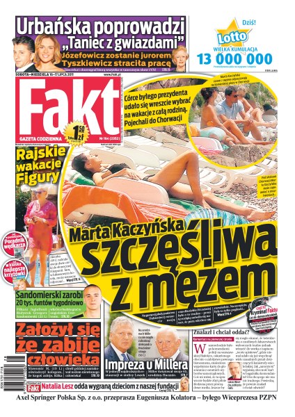 Marcie Kaczyńskiej udało się wreszcie wybrać na wytęsknione wakacje w gronie rodziny; zobacz, jak wygląda rajski wypoczynek Katarzyny Figury; Aleksander Kwaśniewski bawił się na 65. urodzinach Leszka Millera; szaleniec założył się z kolegami, że kogoś zabije i w kilka chwil później zaatakował nożem niewinnego człowieka; Grzegorz Sandomierski, zawodnik Jagiellonii Białystok, będzie zarabiać 20 tys. funtów tygodniowo.