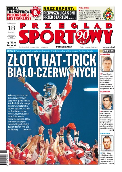 Polacy po raz trzeci z rzędu zostali najlepszą drużyną świata w żużlu; Argentyna odpadła z turnieju piłki nożnej Copa America; Mark Cavendish odniósł swoje 19. zwycięstwo w Tour de France; Wisła Kraków ma już gotowy skład na rozgrywki w Lidze Mistrzów; rozmowa z Maciejem Skorżą, trenerem Legii Warszawa; koszykarz Marcin Gortat planuje występować w Europie do czasu, gdy rozgrywki w USA zostaną wznowione.