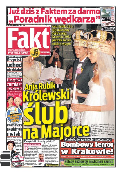 Anja Rubik i jej ukochany Serb Sasha Knezevic pobrali się na rajskiej wyspie, zobacz zdjęcia z cudownej uroczystości naszej ślicznej modelki; według najnowszych badań aż 80 proc. Polaków jest zadowolonych ze swojego życia – czy aby na pewno; jak wygląda zwykły dzień Donalda Tuska; szokujące informacje z raportu komisji ministra MSWiA Jerzego Millera.