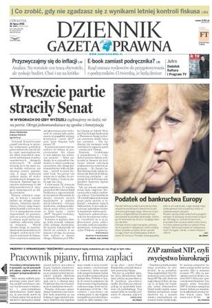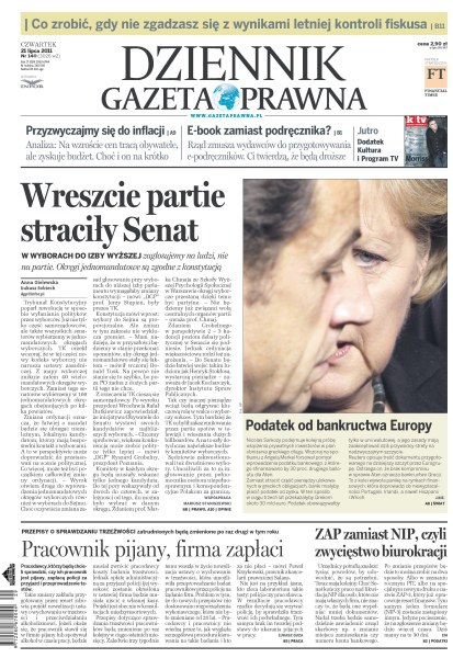 Rząd zmusza wydawców do przygotowywania e-podręczników; co zrobić, gdy nie zgadzasz się z wynikami letniej kontroli fiskusa; wszystkich senatorów wybierzemy w jednomandatowych okręgach wyborczych; Nicolas Sarkozy próbuje włączyć prywatnych inwestorów w plan obniżenia greckiego długu; przepisy o sprawdzaniu trzeźwości zatrudnionych będą zmienione po raz drugi w tym roku; Polacy coraz chętniej wykupują polisy ubezpieczeniowe na czas podróży.