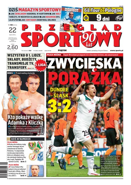 Śląsk Wrocław przegrał na wyjeździe z Dundee United 3:2, ale mimo to awansował na kolejnej fazy eliminacji do Ligi Europejskiej; trwa ostra rywalizacja stacji telewizyjnych o prawo transmisji walki Tomasza Adamka o tytuł mistrza świata; kluby ekstraklasy mają zamiar domagać się odszkodowań od Skarbu Państwa; trener Robert Maaskant chce przedłużyć kontrakt z Wisłą Kraków.