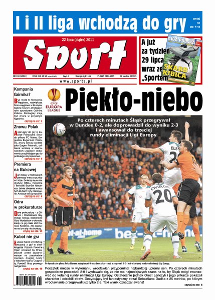 Po czterech minutach meczu z Dundee United Śląsk Wrocław przegrywał 2:0, ale ostatecznie zdołał doprowadzić do wyniku 3:2 i awansować do kolejnej rundy eliminacji Ligi Europy; Kompania Węglowa będzie najprawdopodobniej sponsorem strategicznym Górnika Zabrze; Łukasz Kubot wycofał się z gry w turnieju w Poznaniu z powodu kontuzji nadgarstka; niemieccy kibice czekają na triumf swojego kierowcy Formuły 1 na własnym podwórku od 2006 roku.