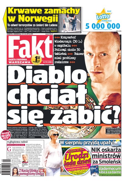 Krzysztof „Diablo” Włodarczyk połknął około trzydziestu tabletek środka antydepresyjnego – spekuluje się, że mistrz świata chciał popełnić samobójstwo; Małgorzata Mołek lada dzień urodzi dziecko; w sierpniu cała Polska zostanie zaatakowana przez fale upałów; NIK oskarża ministrów ze Smoleńska; krwawe zamachy w Norwegii.