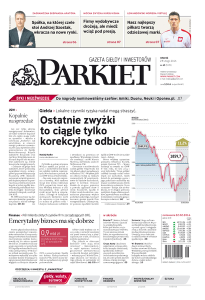 Największy w Polsce newsroom gospodarczy zbiera, analizuje i zgłębia dla Państwa najważniejsze informacje ze świata finansów. Codzienne wydanie „Parkietu”, sześć dni w tygodniu, to kilkadziesiąt artykułów o emitentach, instytucjach finansowych, gospodarce. To również opinie, felietony i wywiady z najważniejszymi ludźmi krajowej i globalnej finansjery.