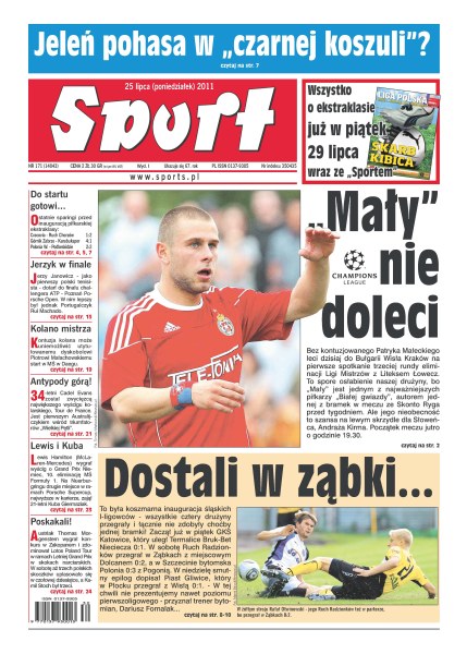 Wisła Kraków leci dziś do Bułgarii bez kontuzjowanego Patryka Małeckiego; koszmarna inauguracja śląskich I-ligowców - wszyscy przegrali i nie zdobyli nawet jednej bramki; ostatnie sparingi przed inauguracją piłkarskiej ekstraklasy; Jerzy Janowicz jako pierwszy polski tenisista dotarł do finału challengera ATP; kontuzja kolana może uniemożliwić dyskobolowi Piotrowi Małachowskiemu start w MŚ w Daegu.