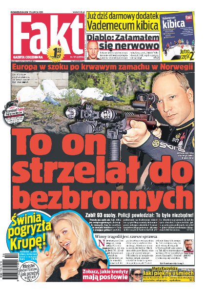 Europa w szoku po krwawym zamachu w Norwegii; Krzysztof „Diablo” Włodarczyk mówi, że załamał się nerwowo; zobacz, jakie kredyty mają posłowie; NFZ o siebie dba, a chorym żałuje; Rafał K. podkładał w Krakowie bomby z nienawiści do ludzi; mąż zaginął po wichurze; Kloss i Brunner znowu w akcji; w Polonii Warszawa chcą Ireneusza Jelenia; Amy Winehouse przegrała walkę z uzależnieniem – przeżyła zaledwie 27 lat.