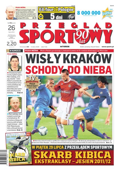 Schody do nieba Wisły Kraków – mistrz Polski gra dzisiaj z Liteksem Łowecz w III rundzie eliminacji Ligi Mistrzów; reprezentacja Anglii może być rywalem podopiecznych Franciszka Smudy 29 lutego 2012 roku; Robert Lewandowski o ewentualnym otrzymaniu polskiego obywatelstwa przez Manuela Arboledę i powołaniu go do kadry; Piotr Małachowski ma nadzieję, że w piątek wystartuje w Sztokholmie.