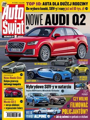 Aktualności: premiery salonu genewskiego, Fiat Tipo, Honda Civic; testy: Nowa Toyota RAV4 Hybrid kontra Mitsubishi Outlander PHEV, Opel Astra, DS4 Crossback, Mini Cooper JCW; konfigurator: Mazda CX-3; porady: co wolno w spotkaniu ze służbami, jak załatwić kartę parkingową, serwis klimatyzacji; z drugiej ręki: Mercedes klasy B (2005-11), top 10 – auta dla dużych rodzin, Toyota Corolla; fascynacje: Alpine wczoraj i dziś, Toyota RAV4 (1999-2004).
