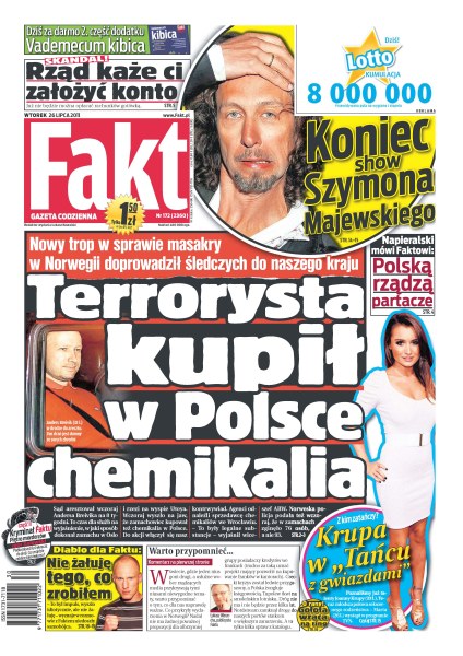 Terrorysta kupił w Polsce chemikalia; Diablo w specjalnym wywiadzie dla Faktu wyznaje, że nie żałuje tego co zrobił; Marta Krupa w Tańcu z Gwiazdami; koniec show Szymona Majewskiego; Grzegorz Napieralski twierdzi, że Polską rządzą partacze; skandal – rząd każe ci założyć konto.