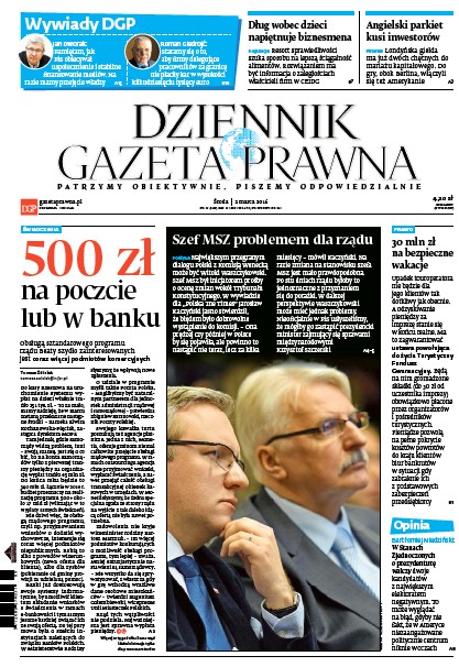 Obsługą programu 500+ zainteresowanych jest coraz więcej podmiotów komercyjnych; największym przegranym dialogu Polski z Komisją Wenecką może być Witold Waszczykowski; upadek touroperatora nie będzie dla jego klientów tak dotkliwy jak obecnie, a odzyskiwanie pieniędzy za imprezę stanie się w końcu realne; resort sprawiedliwości szuka sposobu na lepszą ściągalność alimentów.