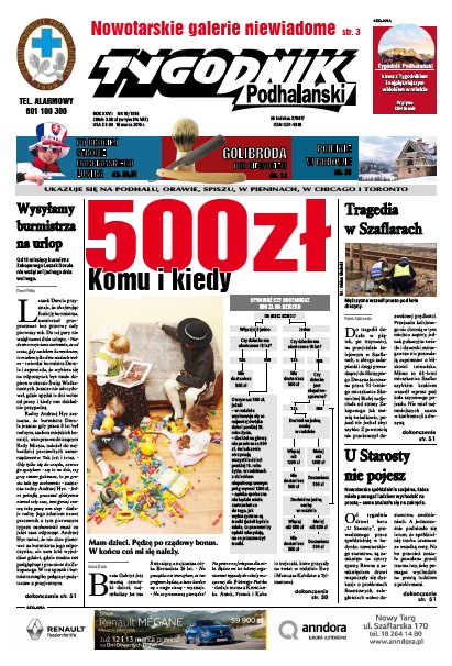 Komu i kiedy przysługuje 500 zł;inwestor jednej z dwóch planowanych galerii handlowych w Nowym Targu do końca kwietnia daje sobie czas na decyzję; po wielu latach przerwy jedna z największych sportowych imprez naszego globu - Puchar Świata w narciarstwie alpejskim - zawitał w Tatry; w marcu w TTV zobaczymy salon fryzjerski z Witowa; budownictwo i rynek nieruchomości na Podhalu; nowotarska spółdzielnia socjalna, która