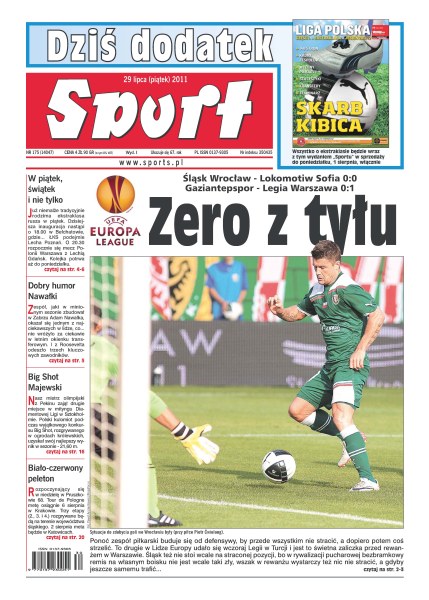 Śląsk Wrocław bezbramkowo zremisował z Lokomotiw Sofia; Legia Warszawa wygrała z Gaziantepspor 1:0; co prawda w Formule 1 ostatnie dwa wyścigi wygrali kierowcy Ferrari i McLarena, ale na Węgrzech w roli faworyta wystąpi Red Bull; koszykarskie Mistrzostwa Europy do lat 18 wkraczają w decydującą fazę – dziś w ćwierćfinale Polacy zmierzą się z Włochami i jeżeli wygrają, znajdą się w strefie medalowej; Tomasz Majewski zajął drugie miejsce w mityngu Diamentowej Ligi w Sztokholmie.