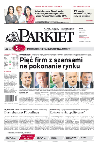 Największy w Polsce newsroom gospodarczy zbiera, analizuje i zgłębia dla Państwa najważniejsze informacje ze świata finansów. Codzienne wydanie „Parkietu”, sześć dni w tygodniu, to kilkadziesiąt artykułów o emitentach, instytucjach finansowych, gospodarce. To również opinie, felietony i wywiady z najważniejszymi ludźmi krajowej i globalnej finansjery.