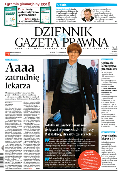 Gazetę wzbogacają praktyczne dodatki dla specjalistów, niedostępne w kioskach: Księgowość i Podatki, Rachunkowość i Audyt, Firma i Prawo, Samorząd i Administracja, Prawnik, Kadry i Płace, Ubezpieczenia i Świadczenia. NOWOŚĆ 2021 r. dodatki Biuro Rachunkowe i Księgowość Budżetowa (dostępne raz w miesiącu). Dodatkowo publikujemy wyjątkowo cenione przez Czytelników specjalne dodatki dotyczące najważniejszych zmian, nowych rozwiązań, na gorąco odpowiadamy na pytania. Piszemy o pracy zdalnej, o tarczach antykryzysowych, o nowych przepisach do walki z epidemią, o sposobach walki z zatorami płatniczymi i nowych obowiązkach pracodawców. Zapewniamy bezpieczeństwo w stosowaniu zmieniającego się prawa.