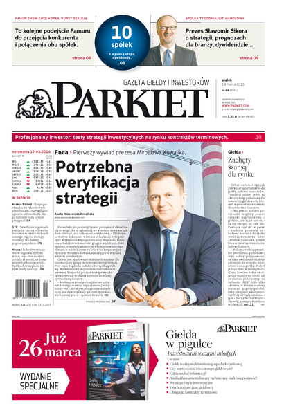 Największy w Polsce newsroom gospodarczy zbiera, analizuje i zgłębia dla Państwa najważniejsze informacje ze świata finansów. Codzienne wydanie „Parkietu”, sześć dni w tygodniu, to kilkadziesiąt artykułów o emitentach, instytucjach finansowych, gospodarce. To również opinie, felietony i wywiady z najważniejszymi ludźmi krajowej i globalnej finansjery.