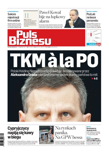 Polski Holding Nieruchomości pokazuje, że Aleksander Grad wcale nie ma zamiaru odpolitycznić spółek skarbu państwa; Centralna Ewidencja i Informacja o Działalności Gospodarczej okazała się sukcesem – zarejestrowano 11 tysięcy firm; europoseł Paweł Kowal ostrzega o ewentualnych działaniach Unii Europejskiej wobec złóż gazu łupkowego; GlaxoSmithKline wsparł pracowników poznańskiego centrum w ratowaniu PozLabu; fundusz Alenaco Holding kupił 85 proc. udziałów w sieci kawiarni W Biegu Café; na rynkach finansowych panika – na GPW bessa; fundusze Supernova IDM i BBI Capital łączą siły i planują emisję za 260 mln zł.